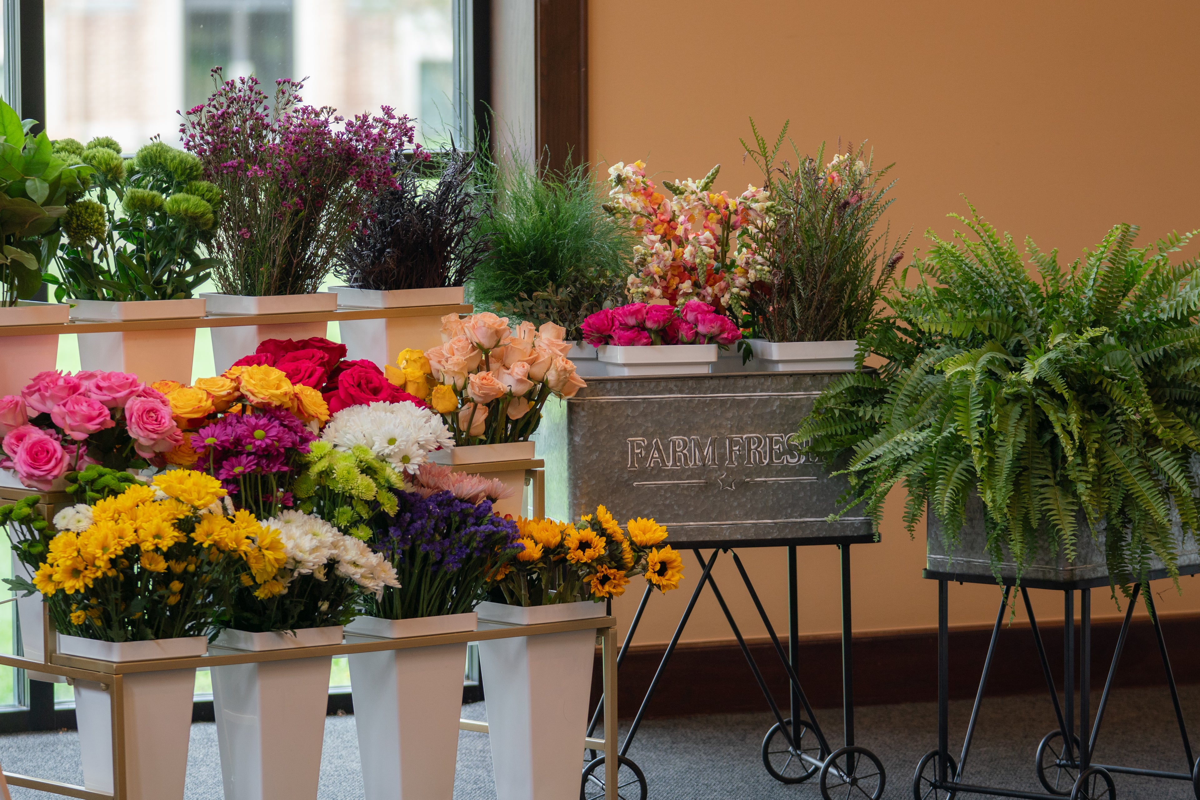 - Guests choose fresh blooms, greenery, vases, and ribbons.